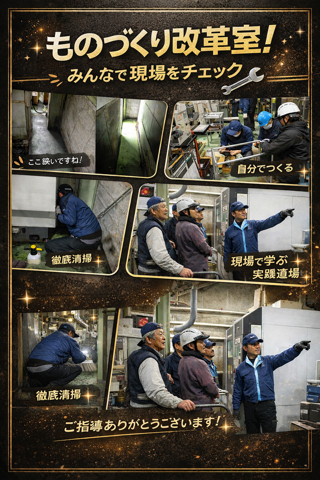 豊田自動織機さまのものづくり改革室の皆様にご指導いただき現場改善活動をおこなっています。改革室の皆様は率先垂範まさかここまで⁉ ぼくたちもやるぞ!